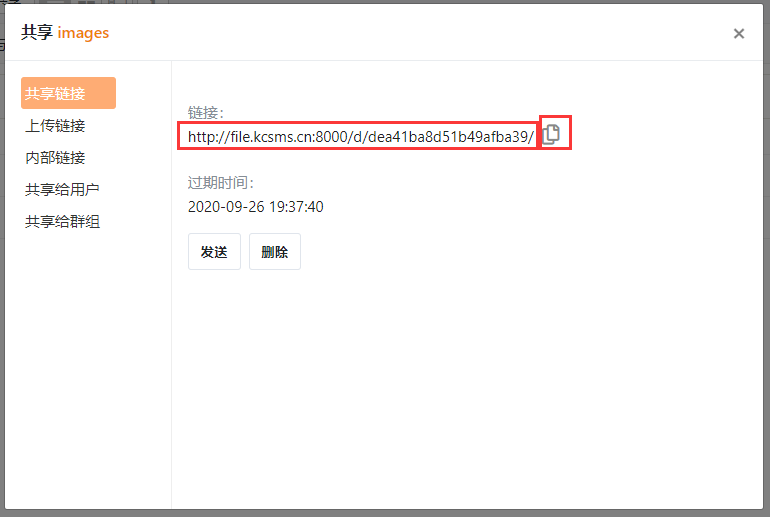 WEB管理页面 http://file.kcsms.cn:8000/ - 选择需要分享的文件,点击分享按钮
