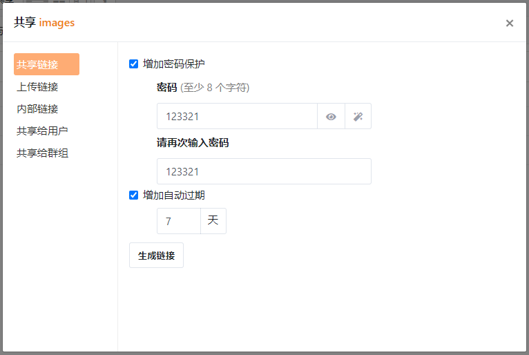 - 选择分享类型和选项,比如可以设置密码等,然后把生的链接发送给好友即可。