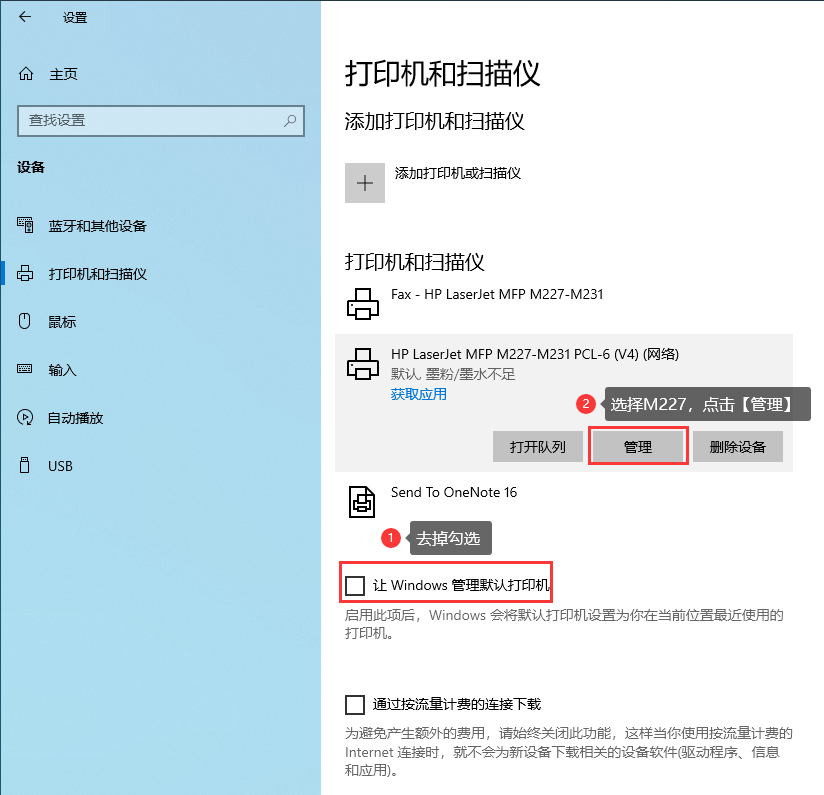 在打印机管理页面,去掉勾选【让Windows管理默认打印机】,然后点击刚添加的打印机,选择【管理】。