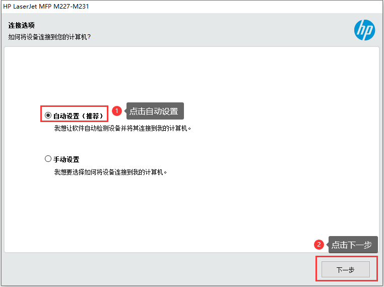 连接选项:选中【自动设置】,点击【下一步】。也可以选择手动设置,输入打印机IP地址192.168.0.33,随便在哪个路由都可以操作。