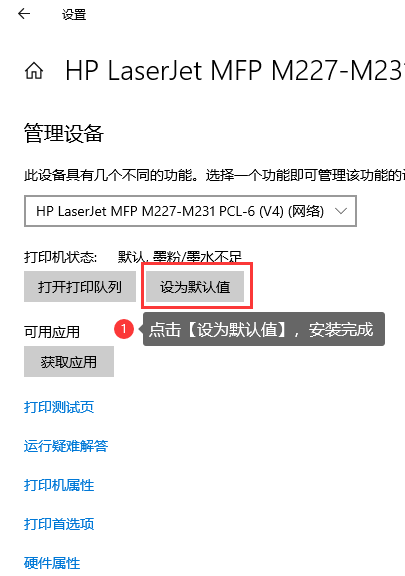 点击【默认值】,默认打印机设置成功