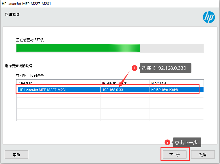当出现M227型号打印机时,选中它,并点击【下一步】